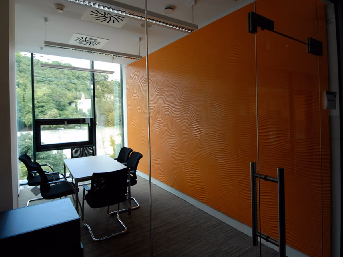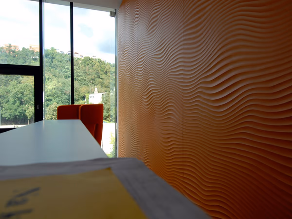 Dodávka a inštalácia 3D panelov Muraspec Ocean v rokovacích miestnostiach a oddychových zónach banky, dodávka a inštalácia tapiet Muraspec na chodbách a prístupových miestnostiach centrály. Panely 3D vytvorili unikátnu atmosféru a príjemne oživili priestory inštitúcie. Autori návrhu: A.M. Architects.