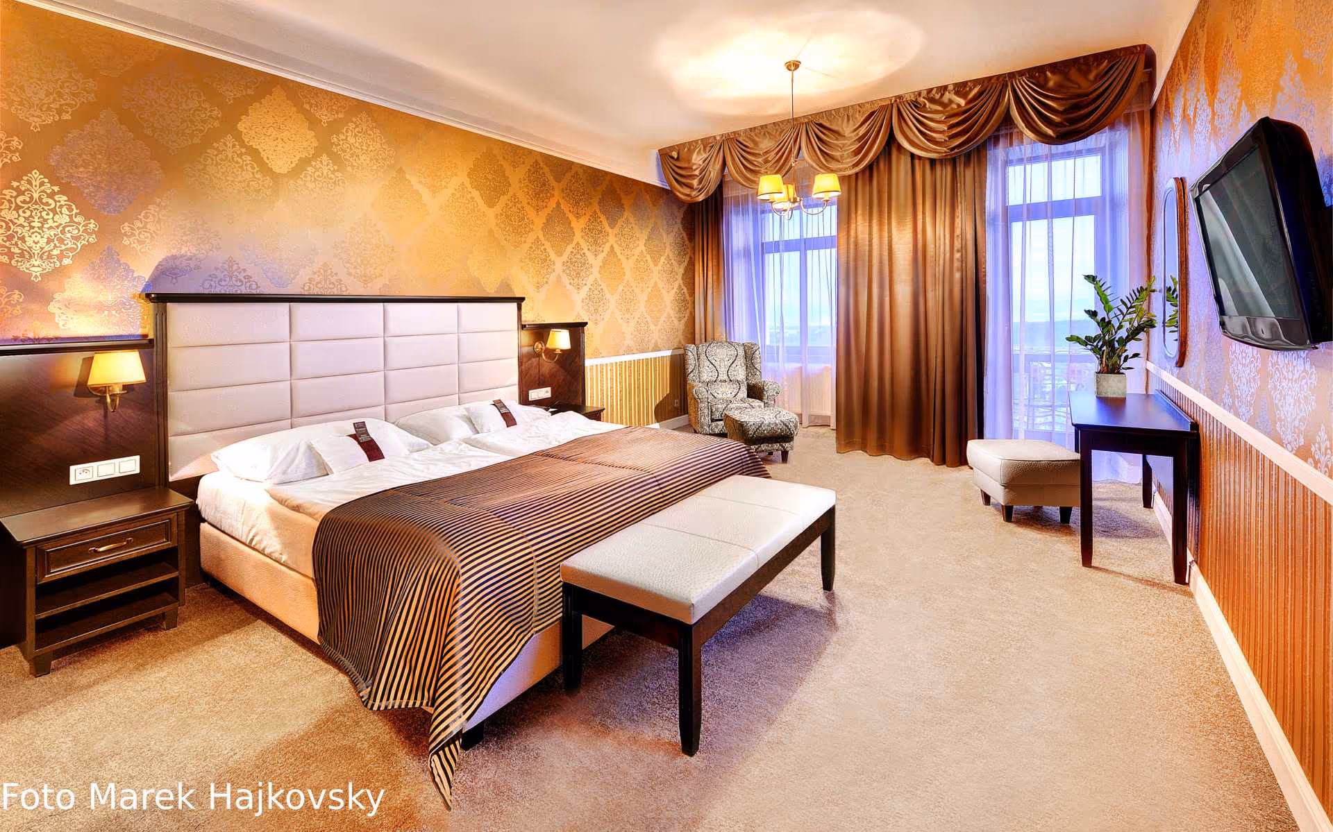 Kompletná rekonštrukcia izieb a apartmánov hotela , odstránenie pôvodných tapiet, vyrovnanie stien nanesenie nových sádrových stierok, dodávka a inštalácia stropných a kazetových ozdobných profilov, tapiet dodávka čalúnickych materiálov, dodávka a inštalácia dekoračných textílií